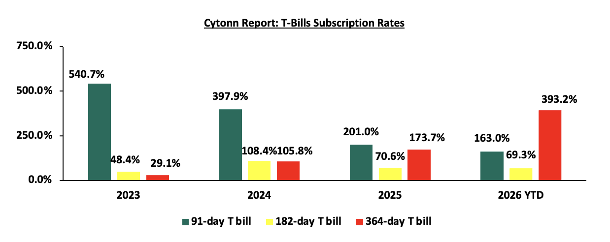 The chart below compares the overall average T-bill subscription rates obtained in 2023, 2024, 2025 and 2026 Year-to-date (YTD):