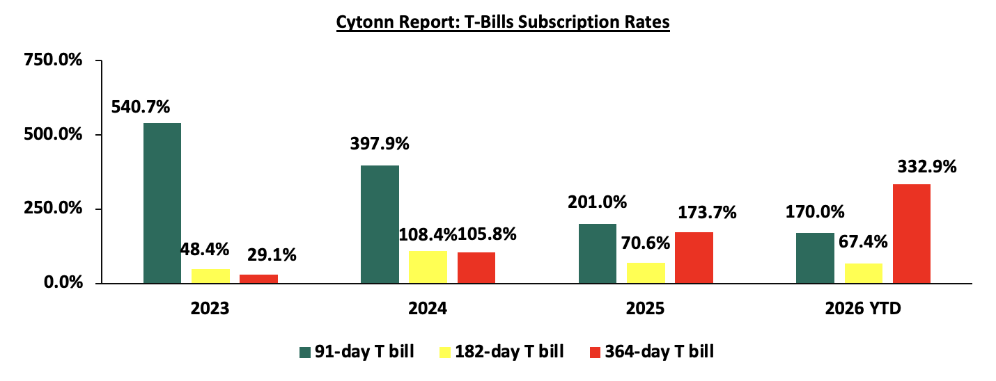 The chart below compares the overall average T-bill subscription rates obtained in 2023, 2024, 2025 and 2026 Year-to-date (YTD):