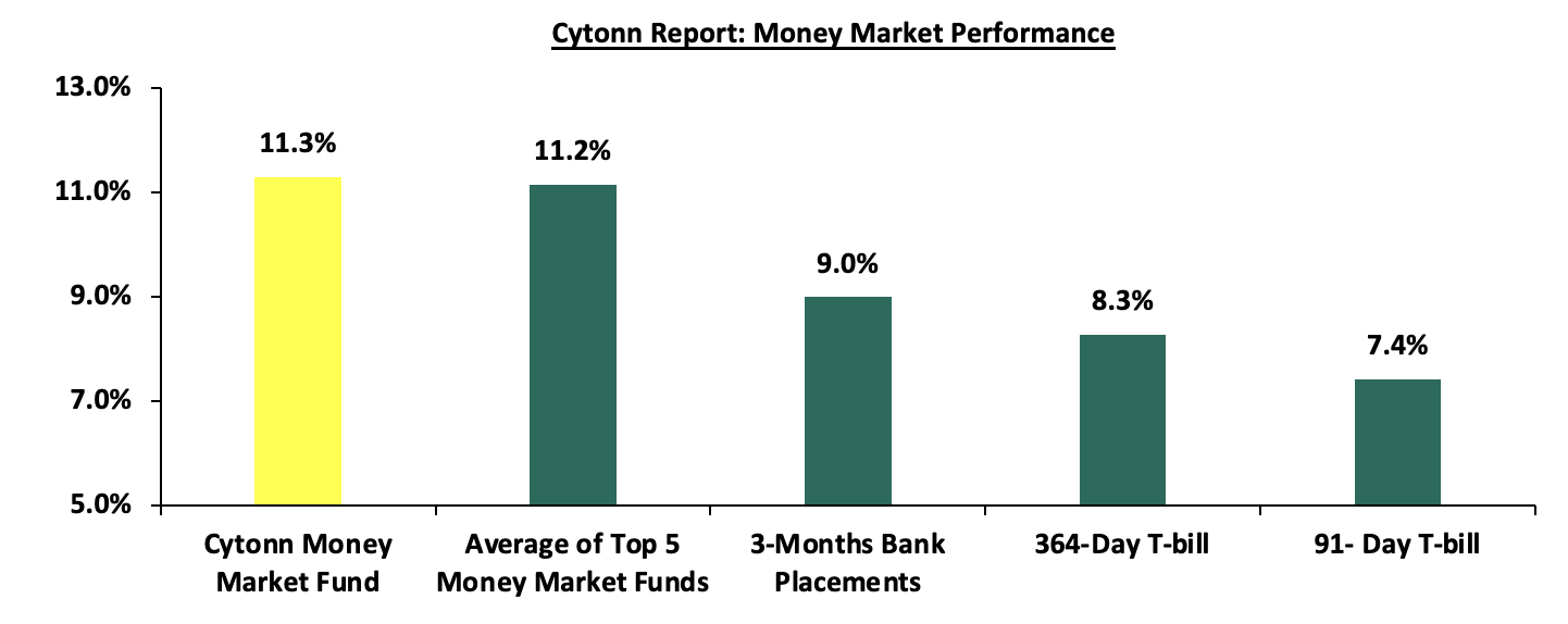In the money markets, 3-month bank placements ended the week at 9.0% (based on rates offered by various banks). The yields on the 364-day paper decreased by 6.3 bps to 8.3% from 8.4% recorded the previous week, while the yields on the 91-day paper also decreased by 14.2 bps to 7.4% from 7.6% recorded last week. The yield on the Cytonn Money Market Fund decreased by 22.0 bps to 11.3% from 11.5% recorded the previous week, while the average yields on the Top 5 Money Market Funds decreased by 4.0 bps to remain relatively unchanged at 11.2% recorded the previous week.