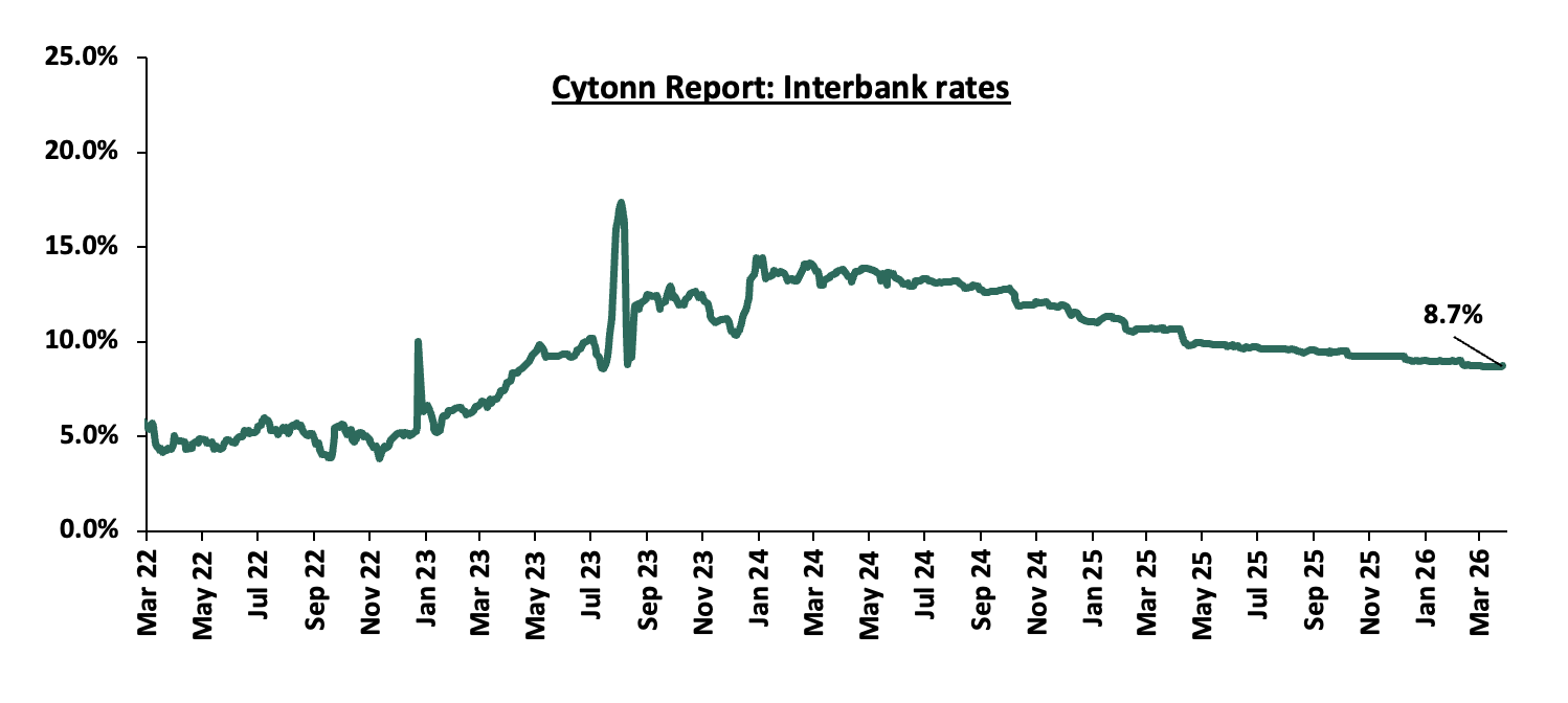 In the primary bond market, the government is looking to raise Kshs 20.0 bn through the switch auction from FXD1/2016/010 to FXD1/2018/015 with fixed coupon rates of 15.0% and 12.7% respectively and tenors to maturity of 0.3 years and 7.1 years respectively. The period of sale for the two bonds opened on Monday 23rd March 2026 and will close on Monday 13th April 2026. Our bidding ranges for the switch to FXD1/2016/010 from FXD1/2018/015 is 12.25%-12.55% respectively;