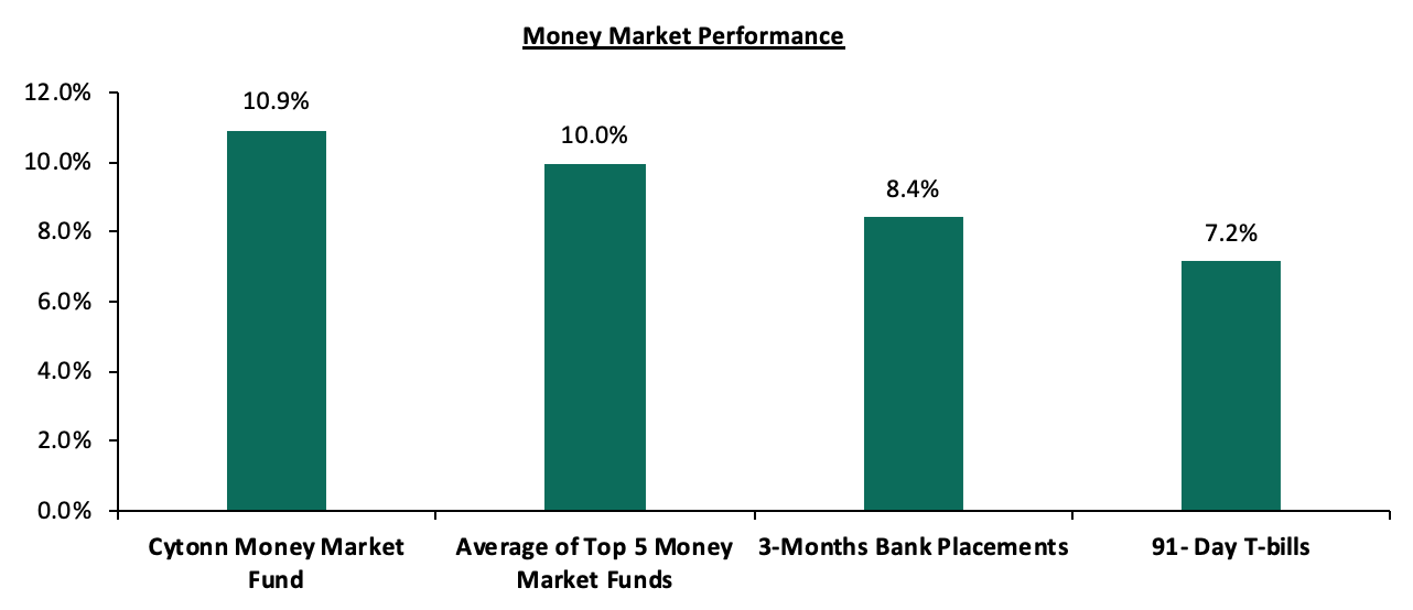 In the money markets, 3-month bank placements ended the week at 8.4% (based on what we have been offered by various banks), the 91-day T-bill came in at 7.2%, while the average of Top 5 Money Market Funds came in at 10.0%, unchanged from the previous week. The yield on the Cytonn Money Market Fund remained unchanged at 10.9%.