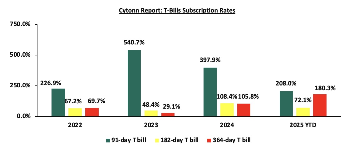 The chart below compares the overall average T-bill subscription rates obtained in 2022,2023, 2024 and 2025 Year-to-date (YTD):