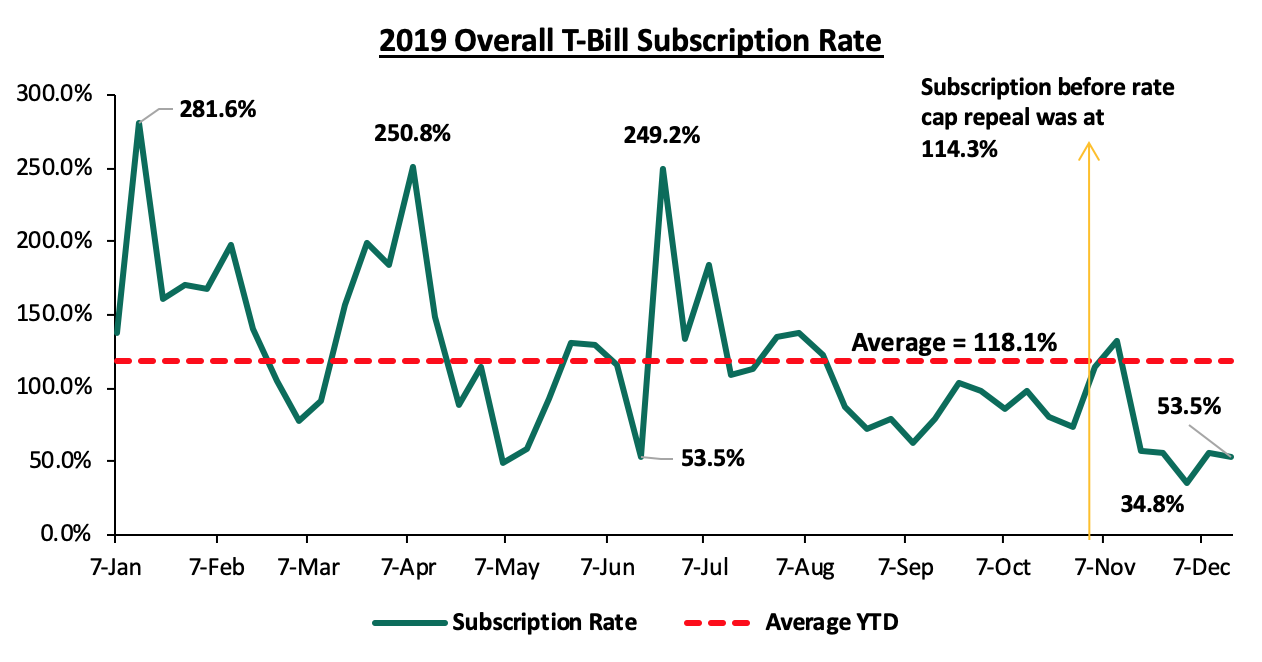 It is important to note that only a month after the repeal of the Interest Rate cap (7th Nov), the overall subscription rate has declined to lows of 34.8%, which is 83.3% points lower than the YTD average of 118.1%. We attribute this to reduced demand for government paper from the banking sector following the repeal of the interest rate cap. Below is a chart highlighting the performance through the year: