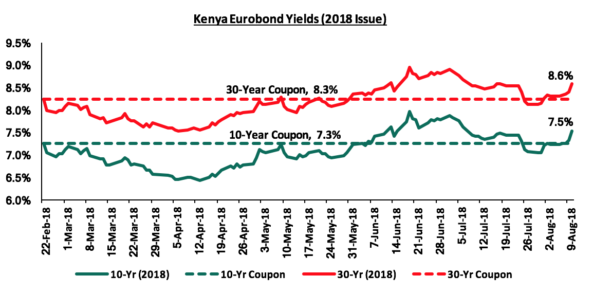 For the February 2018 Eurobond issue, during the week, the yields on both the 10-year and 30-year Eurobonds increased by 0.3% points each, to 7.5% and 8.6% from 7.2% and 8.3% the previous week, respectively. Since the issue date, the yields on the 10-year and 30-year Eurobonds have increased by 0.2% points and 0.3% points, respectively.