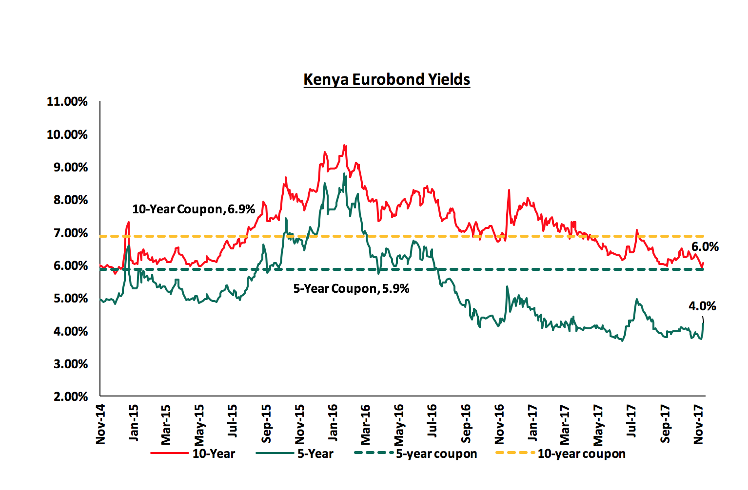 According to Bloomberg, yields on the 5-year and 10-year Eurobonds declined by 20 bps and 30 bps, respectively, during the week, to close at 4.0% and 6.0%, from 4.2% and 6.3% the previous week, respectively. Since the mid-January 2016 peak, yields on the Kenya Eurobonds have declined by 4.8% points and 3.6% points for the 5-year and 10-year Eurobonds, respectively, due to the relatively stable macroeconomic conditions in the country. The declining Eurobond yields and stable rating by Standard & Poor (S&P), in spite of the political uncertainty around the presidential poll re-run, are indications that Kenya’s macro-economic environment remains stable and hence an attractive investment destination. However, concerns from Moody’s around Kenya’s rising debt to GDP levels may see Kenya receive a downgraded sovereign credit rating.