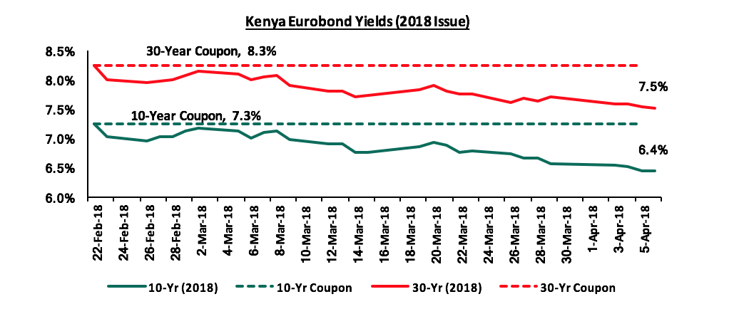 For the February 2018 Eurobond issue, during the week, the yields on the 10-year and 30-year Eurobonds declined by 20 bps each to 6.4% and 7.5% from 6.6% and 7.7%, respectively, the previous week. Since the issue date, yields on the 10-year and 30-year Eurobonds have declined by 0.8% points and 0.7% points, respectively, indicating foreign investor confidence in Kenya’s macro-economic prospects.